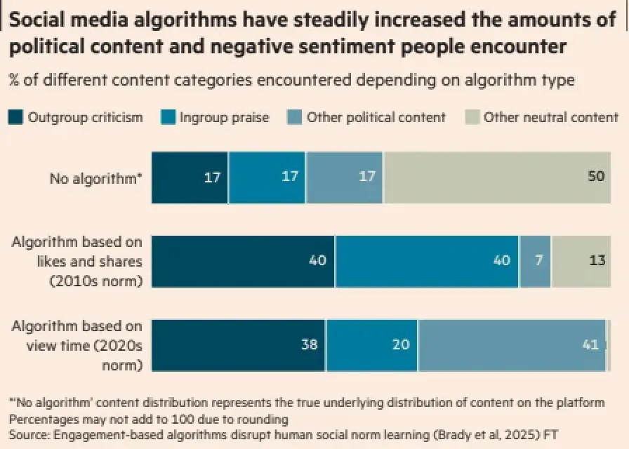 the recommendation algorithm based on likes and shares (essentially how social media worked during the 2010s) consistently boosted posts that praised the viewer’s in-group and blamed their out-group, as well as pushing much more political messages into people’s feeds.